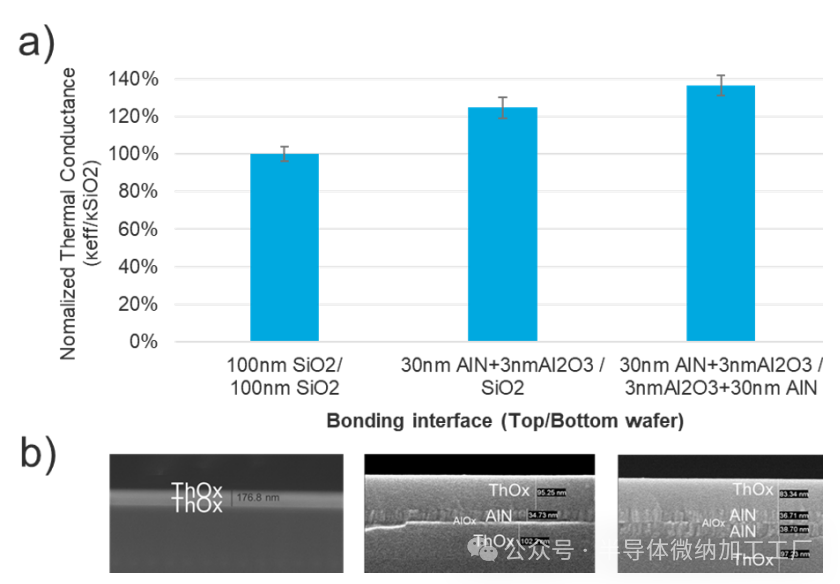 a) 键合界面的热导率测量,显示通过集成30nm AlN + 3nm Al2O3封闭层后,导热率较SiO2提高了36%。
