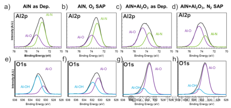 AlN(a, b, e, f)和AlN + 3nm Al2O3(c, d, g, h)薄膜的XPS光谱,分别在表面激活等离子体前后测量。