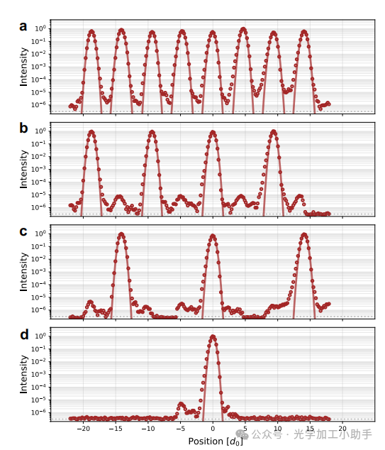 b–d, 对阵列中部分通道进行选择性寻址时的强度分布,分别对应 4 个(b)、2 个(c)以及单个(d) 激活通道的情况。