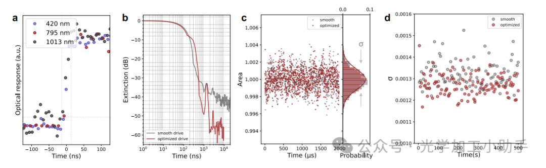 b, 在关断后的动态消光随时间变化曲线,对比平滑驱动(灰色)与优化驱动(红色)的效果。