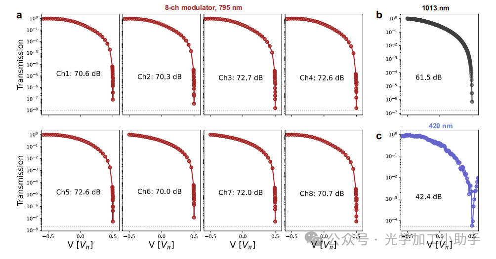 最后,长期运行稳定性与高功率承受能力对于实际应用至关重要。在 795 nm 下,器件表现出强健的性能,即便在总输入功率超过 1 W(约每通道 100 mW)的条件下连续运行数月,也未观察到退化或不稳定性。为抵消缓慢的热漂移,我们实现了 5 Hz 的反馈回路,主动稳定调制器的偏置点。该系统在 20 小时 的运行中成功地将消光比稳定锁定在 69.8 ± 3.0 dB(详见补充信息)。在 420 nm 下,当输入功率超过 10 mW 时,我们观察到缓慢的功率波动,提示存在功率相关的不稳定性。对这种短波长不稳定性的起因与抑制方法的进一步研究,将是未来的工作方向。