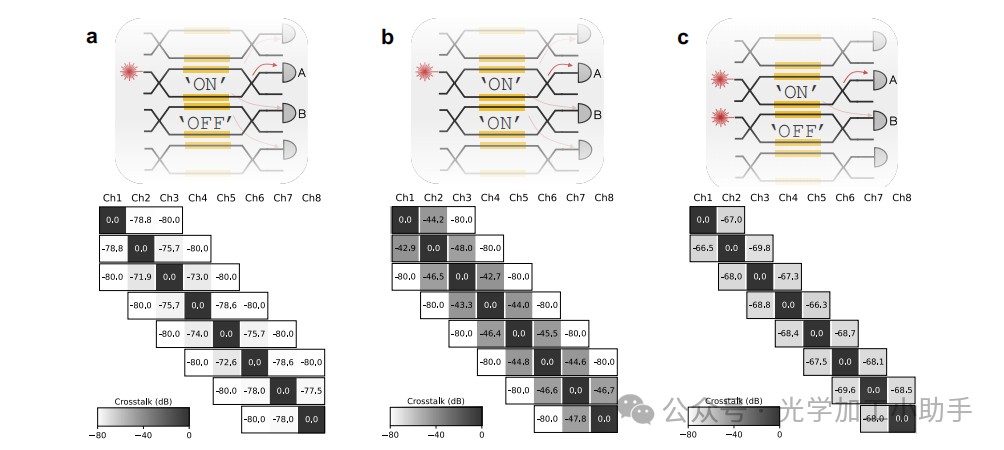 b, 串扰矩阵:一个处于光学激活(ON)状态的通道邻近一个处于光学未激活但保持在 ON 状态的调制器时的情况。