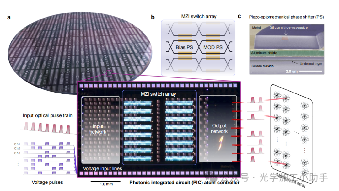 a, 已完成加工的 200 mm 晶圆,用于实现对原子量子比特阵列的精确光学寻址。中央的光学显微图展示了光子集成电路(PIC)中的单个多通道原子控制器,该器件能够将电子波形转换为精确的光脉冲列,从而实现并行的、逐个量子比特的寻址。
