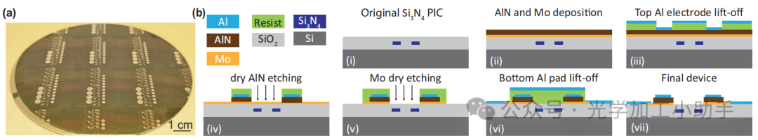 过程从在 8 英寸晶圆上基于铸造的 Si3N4 超低损耗电路开始,然后通过化学机械抛光(CMP)平整顶部的硅光纤包层。将晶圆切割为 4 英寸晶圆后,使用干法刻蚀和 Al 硬掩膜在硅包层上刻蚀对准标记。