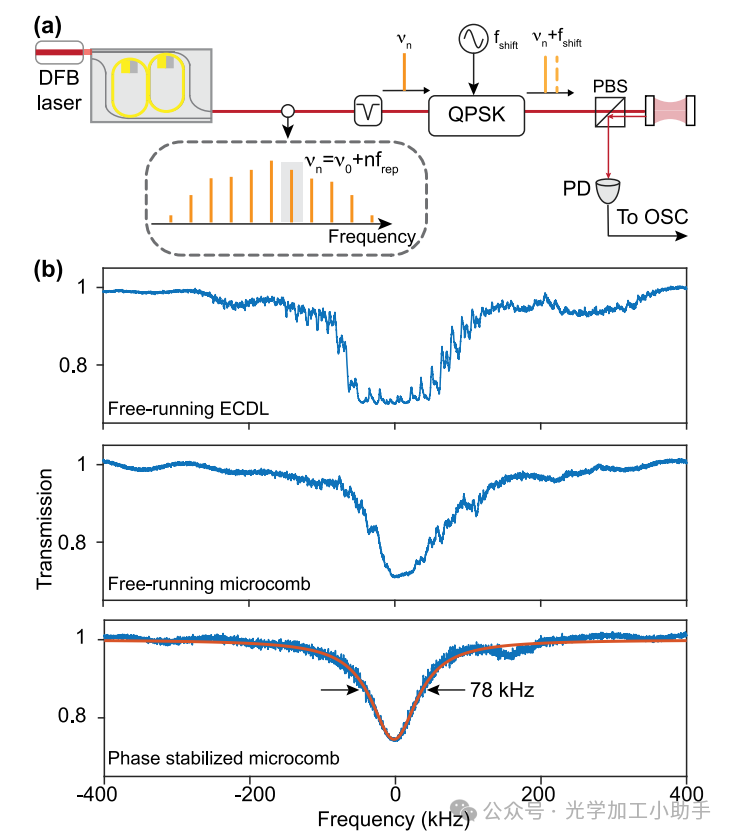 (b) 使用自由运行的 Toptica 激光器(上部)、自由运行的微梳波(中部)和频率稳定的微梳波(下部)测量的 Fabry–Pérot 腔的反射谱。Lorentz 线形谱得到解析,半高宽为 78 kHz(最低面板中的红线)。