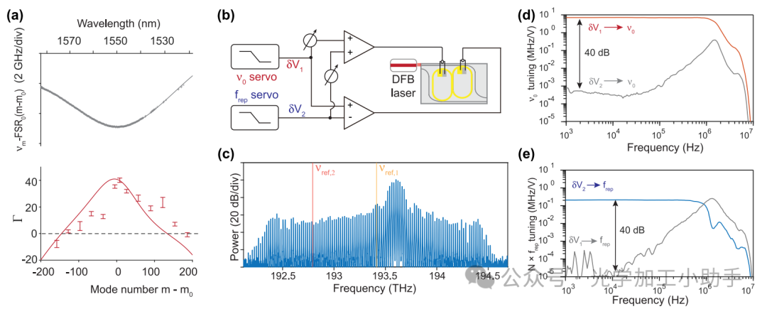 对于压电驱动器,使用图 2(b) 所示电路可以方便地生成共模和差模电压信号。ν0 和 FSR 的伺服控制器生成电压 δV1 和 δV2,这些电压与加法和差分电路耦合,并随后被放大约 2 倍,以提高伺服回路的增益。为了测试系统,微梳波由一台商用 DFB 激光器(Emcore 公司,输出功率 120 mW,波长 1548 nm)进行泵浦,并在自注入锁定操作下工作。该梳波的重复频率约为 20 GHz,带宽约为 2 THz。尽管由于共振腔耦合提供了异常色散,但由于波导色散的贡献,总体色散略为正常。梳波在输出端口的光谱 [15] 如图 2(c) 所示,收集到的输出功率约为 0.3 mW。通过调整频率 Vernier,也可以实现异常色散梳波的操作 [16]。