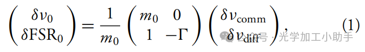 在 m = m0 处(即,ν0 和 FSR0)调谐光学频率和 FSR 是通过压电驱动实现的【图 1(d)–1(f)】。这种调谐由以下矩阵控制(见补充材料第 1 节):