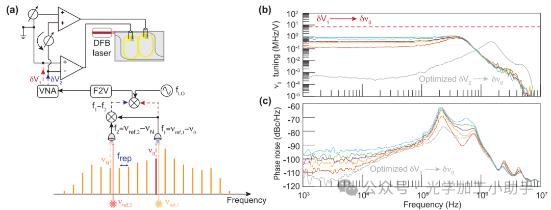 当 ν0 和 frep 之间的调谐串扰未最小化时,观察到过多的噪声(来自锁定残余)。图 6(b) 显示了当 δV2 被调制时测得的 ν0 调谐响应。灰色线是优化(最小化)的响应。通过调节电路(如图 6(a) 中箭头所示)可以增加响应。串扰增加了拍频信号 f1 = νref,1 − ν0 的相位噪声,如图 6(c) 所示。这里,彩色曲线对应于图 6(b) 中的情况。如果串扰(通过调节 δV2 时 δν0 的调谐进行表征)进一步增加,超过图 6(b) 中浅蓝线的位置,微梳波频率稳定化将无法实现。