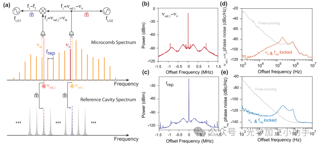 (d) 微梳波在自由运行(灰色)和频率稳定化(红色)状态下,参考激光器 1 和梳波之间的拍频信号的相位噪声光谱。
