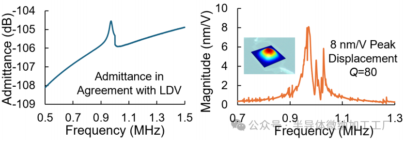 制造的设备在空气中通过激光多普勒振动计(LDV)直接测量膜结构位移进行了表征。使用苏黎世阻抗分析仪进行的电气导纳测量,如图3(a)所示,确认了约为0.97 MHz的共振存在。测量范围的切换导致了轻微的不连续性。较高的导纳值表明存在穿透效应,未来的研究将进一步探讨这一问题。相应的面外膜位移谱如图3(b)所示,展现了一个尖锐的共振峰,测得的位移约为8 nm/V。位移的减小可能是由基底穿透寄生效应引起的。测得的共振频率略微低于FEA预测的1.1 MHz。这一偏移预计是由于电极的质量加载和寄生效应所致。尽管如此,测得的最大膜位移340 pm/V与预期的模式形态一致,并验证了图2中的双形驱动机制。