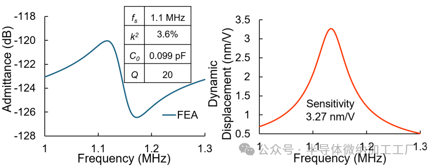 首先使用COMSOL有限元分析(FEA)对设备结构进行了分析。如图2(a–b)所示,施加在顶部电极上的横向电场通过强烈的e11系数(4.65 C/m²)在LN层中诱导平面内应力(Tx)。由于双形LN堆叠结构的Z轴取向被反转,在相同电场作用下,两层产生相反符号的应力,这些应力在厚度方向上相加,从而增强了面外位移。该薄膜堆叠结构由10 µm LN和2 µm SiO2组成,旨在防止电荷抵消并最大化电机械耦合。电极交替偏置并放置在应力反节点附近,而外部电极延伸到悬浮区域外,以提高能量转移。图2(c)中的仿真导纳谱显示了在1.1 MHz左右的明显共振,对应有效耦合度为3.6%,高于已报告的ScAlN同类材料[29],[30]。静态电容(C0)为0.099 pF,质量因子(Q)设置为20。同时,图2(d)绘制了动态位移图,显示在共振附近,峰值为3.27 nm/V,突出了强烈的面外振动。