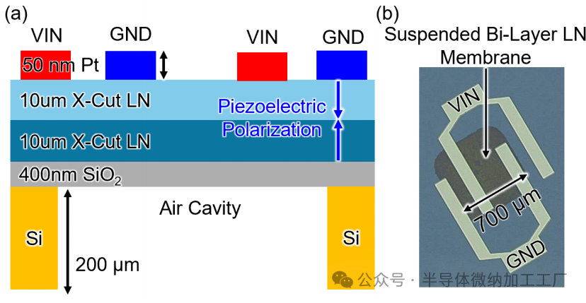 (b) 制造的悬浮LN PMUT的光学图像,标注了顶部电极为VIN和GND。