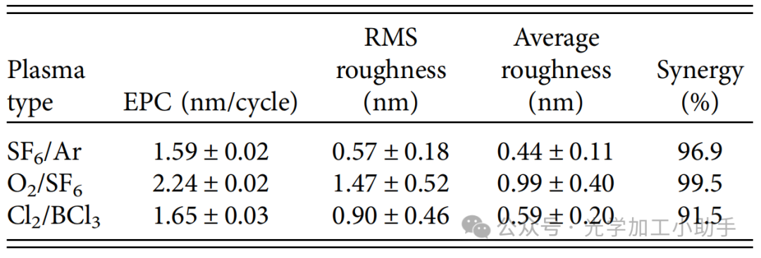 表II比较了这三种不同工艺的EPC、表面粗糙度和协同效应。作为参考,批量LN样品的初始表面粗糙度为Rq = 0.2 nm。O₂/SF₆工艺产生的表面最粗糙,但协同效应最高;而Cl₂/BCl₃工艺与SF₆/Ar工艺产生的刻蚀速率相似,但协同效应是三种工艺中最低的。假设通过降低Cl₂/BCl₃等离子体半步骤的RIE功率,Cl₂/BCl₃工艺可能被修改以提高其协同效应。相比之下,SF₆/Ar工艺在饱和时,在20个周期ALE处理后产生的表面最平滑,Rq为0.57 ± 0.18 nm。表面粗糙度的增加可能是由于LiF和MgF₂的重新沉积。
