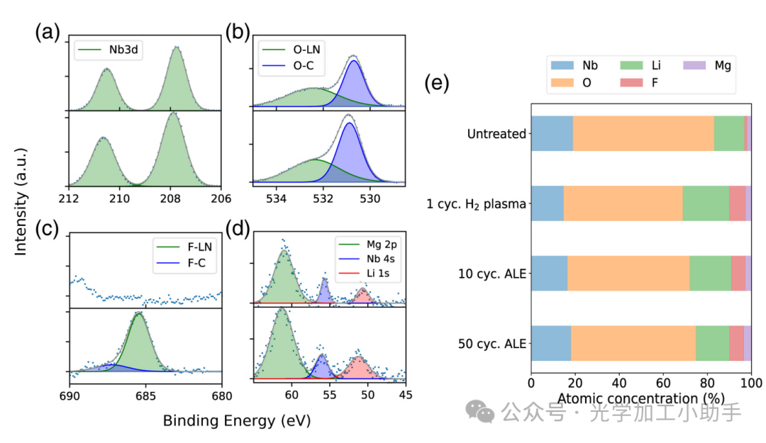 (a) Nb3d, (b) O1s, (c) F1s光谱,和(d) Nb4s, Li1s, Mg2p光谱。光谱分别显示原始和经过50个ALE周期刻蚀后的MgO掺铌锂奈米酸钠(LN)样品。每个周期包含40秒的H₂等离子体曝光,后续为40秒的SF₆/Ar等离子体曝光。