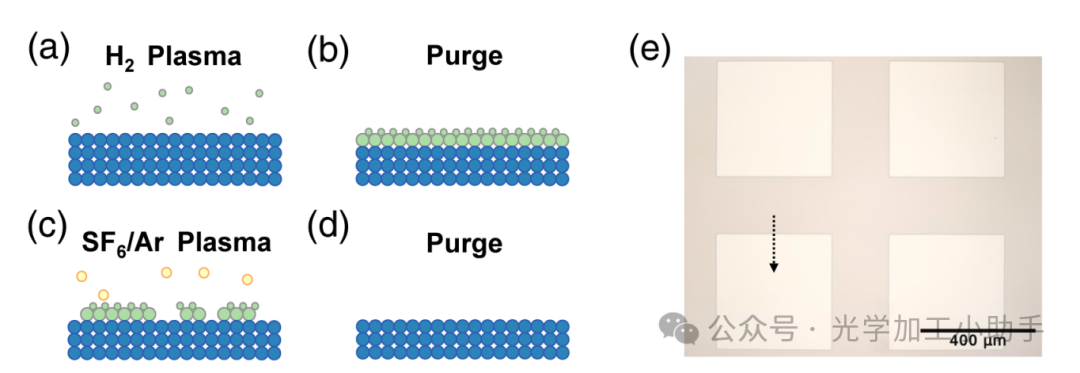 图1. (a)–(d) MgO掺杂LN的ALE工艺。 (a) 氢气等离子体曝光后,(b) 样品顶部形成氢丰富的修饰层。 (c) 随后的SF₆/Ar等离子体曝光产生挥发性物质。 (d) 最后的清洗过程完成了一个周期。 (e) LN晶片上显影光刻图案的显微镜图像(10倍放大)。虚线表示AFM扫描的方向,用于刻蚀深度测量。
