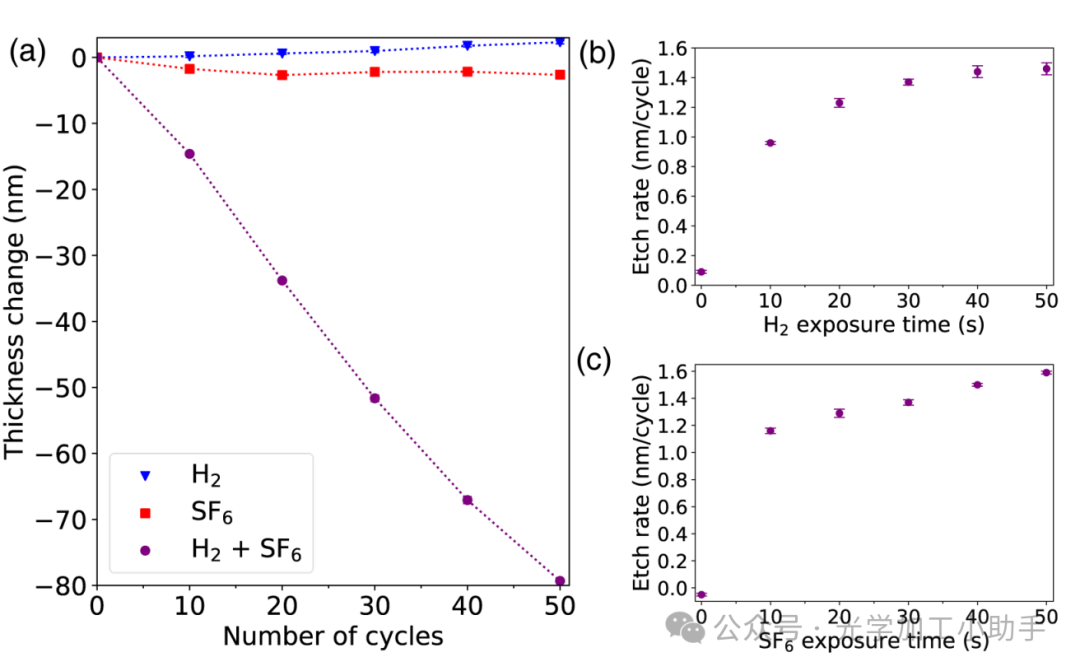 (c) 在H₂等离子体曝光时间固定为30秒时,EPC与SF₆/Ar等离子体曝光时间的关系。观察到刻蚀速率随着曝光时间的增加而饱和,证明了该工艺的自限性特征。