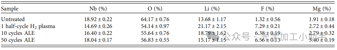 图3(e)展示了不同ALE步骤过程中XPS数据所得到的Nb、Li、Mg、O和F的原子浓度。这些原子浓度是通过将每个样本的碳含量标准化得到的,约为55%,这是由于导电碳涂层的存在。所有原子浓度(包括C)的不确定性是通过CASA-XPS软件使用蒙特卡罗方法估算的,碳标准化的不确定性是通过对各自的不确定性进行平方加和传播的。我们观察到,表面锂含量在1个H₂等离子体半周期后有所增加。氟的存在可能来自于清洗过程后室内残留的氟气。与之前的研究报告不同,在这些研究中发现,在高功率(500–2000 W)、高温(170°C)、长时间(1小时)的H₂等离子体曝光后,表面锂浓度下降,形成了质子交换的LN。可能是由于这些等离子体条件与酸基质质子交换类似,导致了该差异。ALE处理后,F、Li和Mg的比例相比未经处理的样本有所增加。结合前面提到的峰能位移,我们推测LiF和MgF₂已在表面形成并重新沉积,原因是它们的低挥发性。