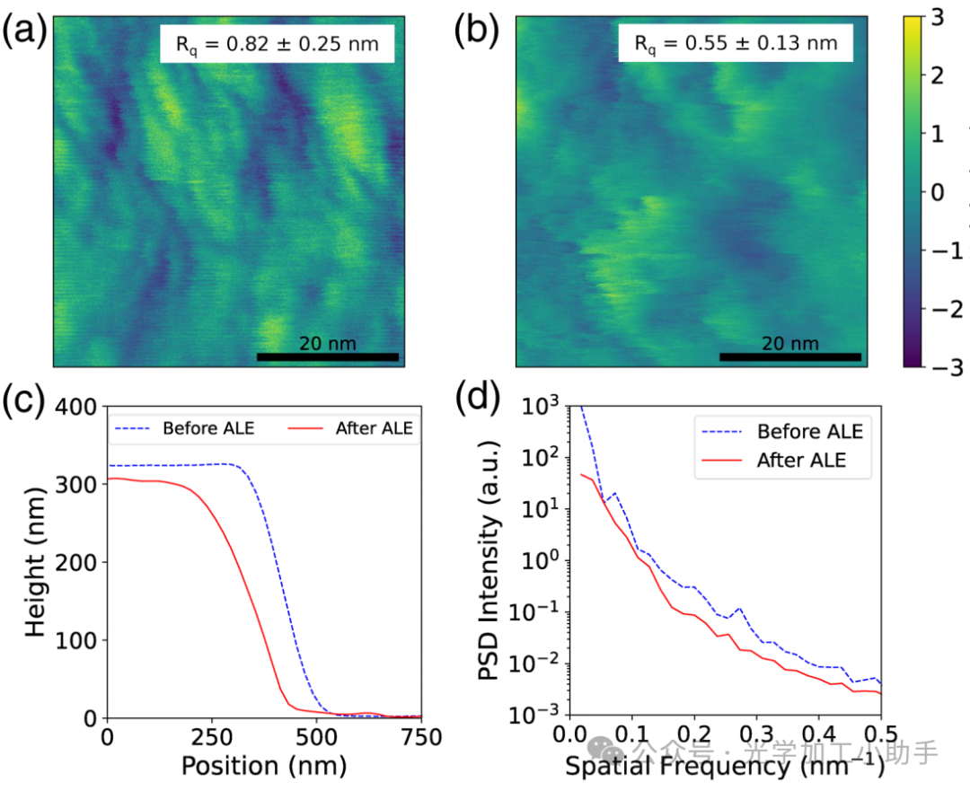 图4. AFM扫描显示TFLN波导侧壁的高度图,经过线性平面倾斜去除前(a)和50次ALE周期后(b)。(c) TFLN波导侧面轮廓的平均AFM线扫描,分别在50次ALE周期之前和之后。波导宽度在每一侧减少了50 nm,得到的横向刻蚀速率为1 nm/周期,与在大块LN上测得的垂直刻蚀速率1.59 nm/周期相当。(d) 样品在ALE之前和经过50个ALE周期后的高度图PSD。