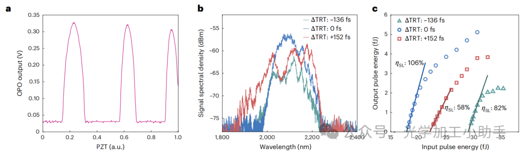 在图2a–c中,我们展示了纳米光子OPO的近阈值性能。通过扫描泵浦的重复频率600Hz,我们观察到OPO的振荡峰(图2a)。这些峰是双重共振操作的特征。在每个振荡峰的中心,我们可以主动锁定泵浦的重复频率,图2b展示了三个振荡峰在泵浦重复周期与腔体往返时间之间的不同失谐下的近阈值信号光谱。在图2c中,我们展示了这些峰的输入-输出脉冲能量增长。通过外推,我们可以得到阈值和斜率效率(ηSL),并将具有最低阈值的峰定义为零腔体失谐状态。对于这个峰,我们估计OPO的阈值约为18飞焦耳。