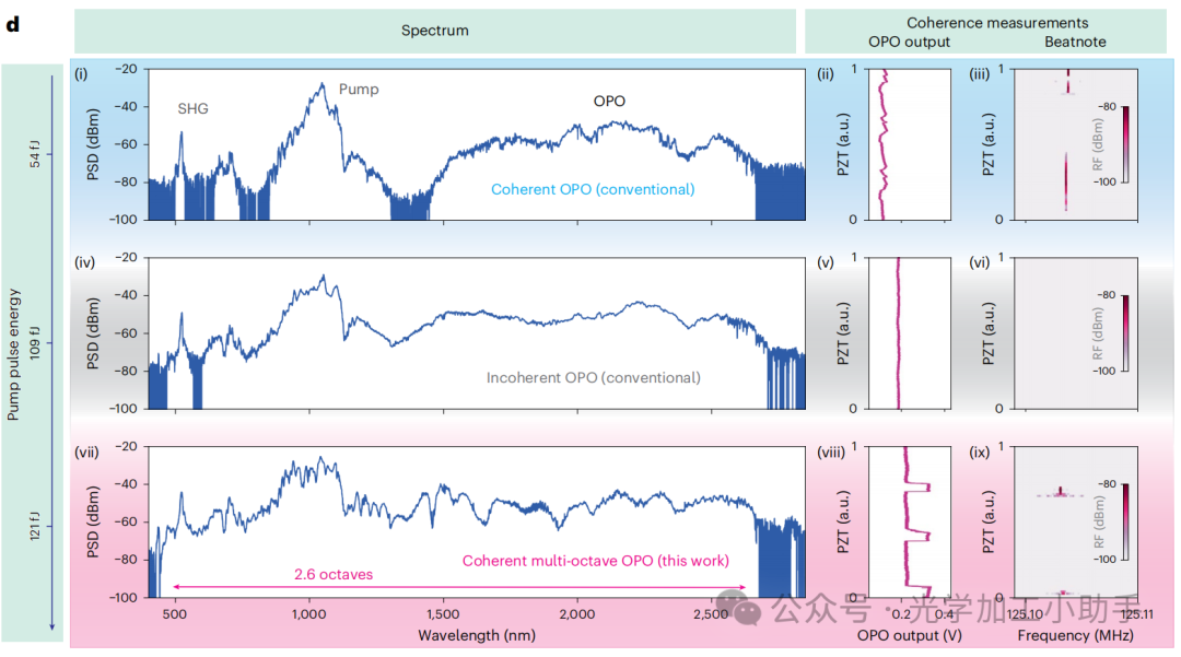 d. 输出光谱,OPO振荡峰和在54飞焦耳、109飞焦耳和121飞焦耳泵浦能量下的拍频测量。图(ii)、(v)和(viii)中的OPO振荡峰是在相同探测器放大设置下获取的。图(iii)、(vi)和(ix)中的射频(RF)拍频是通过自由空间和芯片OPO之间进行测量的,它们共享相同的泵浦,且泵浦重复频率随时间调节,扩展数据见补充材料II-B节。