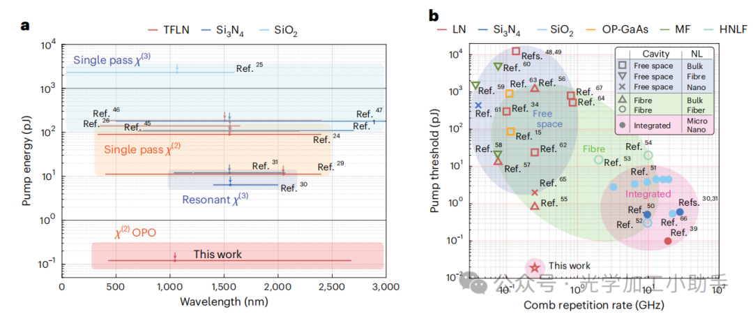 b. 同步泵浦OPO的频率梳重复频率和泵浦阈值能量。标记形状表示每个OPO的不同腔体和非线性(NL)元件组合,分类包括自由空间、光纤、集成、体积、光纤和纳米光子。在两幅图中,顶部的图例表示非线性元件的材料。TFLN为薄膜铌酸锂;OP为定向极化;MF为微结构光纤;HNLF为高度非线性光纤45–67。