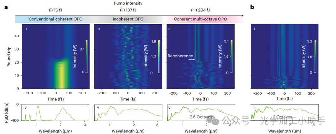 为了说明这个远超阈值的OPO的动力学以及如何在如此宽的光谱范围内建立相干性,我们转向数值模拟。为了捕捉OPO中发生的多倍频非线性交互,我们将纳米光子腔体中的电场建模为频域中的单一包络,并使用分步傅里叶法来描述在周期性极化的铌酸锂区域中的传播,并使用线性滤波器来描述腔体反馈(补充材料III-A节)。在图3a中,我们展示了如何使用与实验相匹配的参数捕捉不同的工作模式。在16飞焦耳(图3a(i))时,OPO超过阈值并在约20次往返后稳定。随着泵浦脉冲能量的增加,OPO形成所需的往返次数减少,在137飞焦耳(图3a(ii),约9倍于阈值)时,我们看到OPO输出变得不相干。最后,在大约204飞焦耳(图3a(iii),约13倍于阈值)时,半谐波恢复了相干性,建立了一个包含时间特征为4fs的二倍频连续梳(补充材料III-C节)。