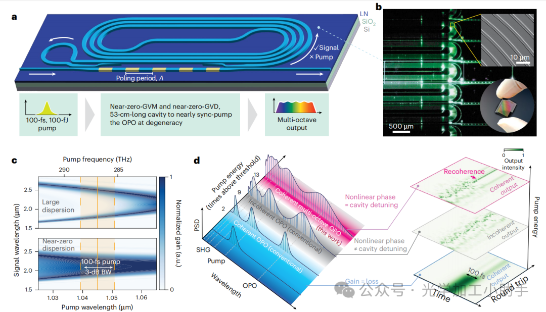 a. 同步泵浦OPO在薄膜铌酸锂上的示意图,突出显示了关键特征。