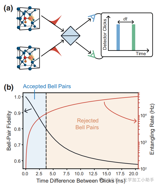 (a) 两个T中心同步发射光子。由于光子波包的有限时间宽度,检测时间会有所不同。