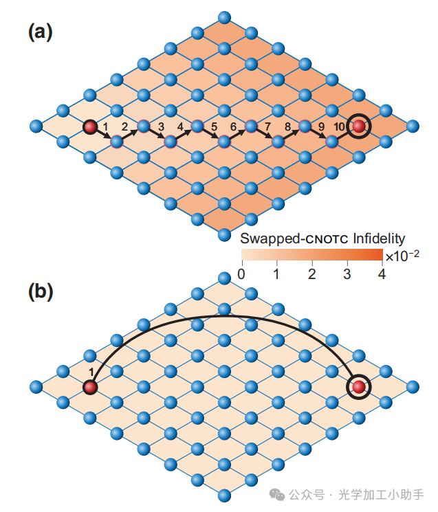 (a) 在平面图中,两个远距离量子比特之间的CNOT门操作需要顺序交换操作。每个连续的操作都会积累误差,整体保真度急剧下降,即使在显示的小距离内也是如此。