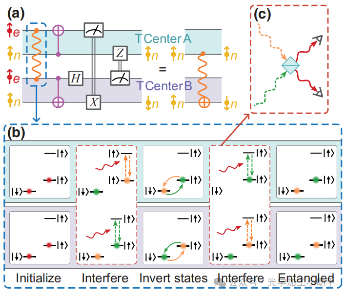 (a) 一个量子电路,用于将量子比特态从远程激光客户端加载到两个不同的量子集线器,并在两个T中心自旋之间执行非局部贝尔态测量。传送CNOT(中间部分)由两个集线器之间的纠缠分发介导。