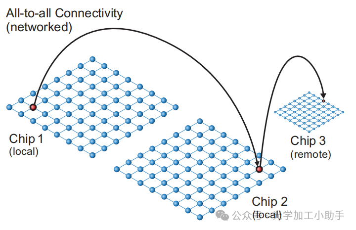 假设模块化量子技术和模块之间的高连接性用于跨模块进行高性能并行物理操作,那么自然的问题是:所有量子比特应如何连接?跨模块实现快速逻辑门的关键是高效的非局部纠缠分发。如果每个量子比特设计为可以轻松与来自其他模块的物理量子比特纠缠,那么可以假设该量子比特支持一种物理过程,允许生成非局部的、而非基于邻近的纠缠。在这样的假设下,模块内和模块之间的连接性不一定受限于基于邻近的量子比特拓扑,可以以任何方式连接,以实现最佳的整体系统性能。