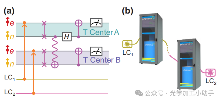 (b) 由于两个T中心之间的CNOT是通过传送实现的,这个电路可以用于在通过通信光纤连接的不同低温箱之间的两个用户之间生成加密密钥。