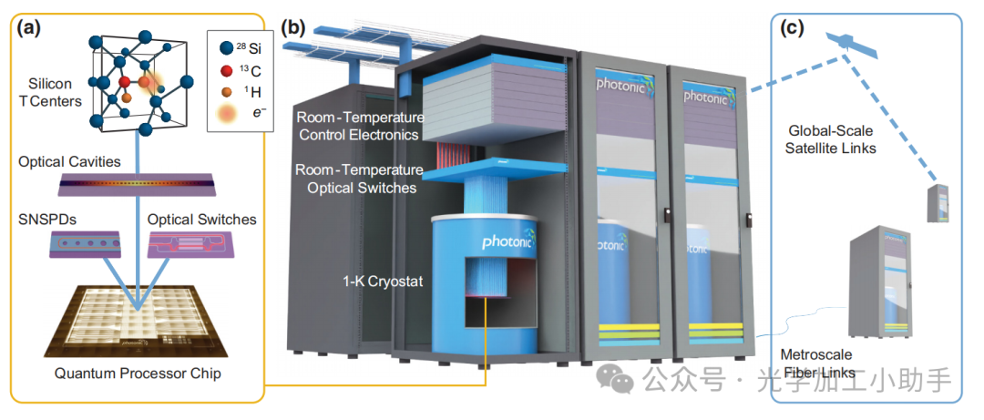 光纤耦合的T中心处理器节点包含通信光学量子存储器,能够支持通过低损耗光纤链路进行长距离通信,并能够生成、存储和处理光学纠缠自旋量子比特。因此,它们可以作为通信波长量子中继器自然工作,从而实现长距离可扩展的多用户量子互联网,并具有在全球网络中为任何两个用户之间安全分发纠缠或连接量子处理器的潜力(见图1)。