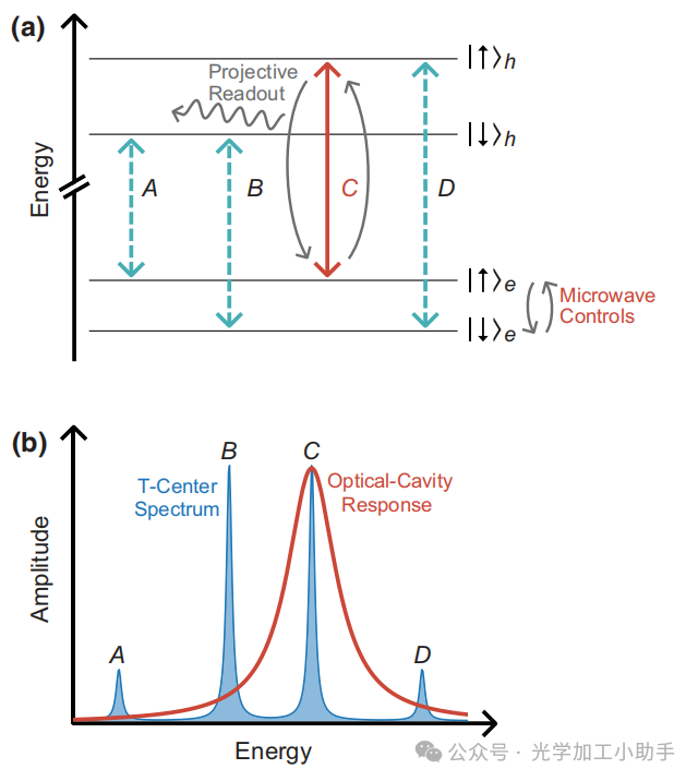 (b) T中心电子自旋的光学谱,叠加光学腔体以增强C跃迁的发射。