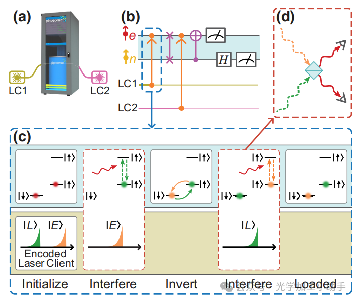 (b) 一个量子电路,利用(a)中的协议为连接到同一集线器的两个用户(激光客户端,LCs)生成加密密钥(c)。从两个用户加载光子,然后对它们进行贝尔态测量,计算它们态的奇偶性,从而实现MA-MDI QKD中的密钥生成。