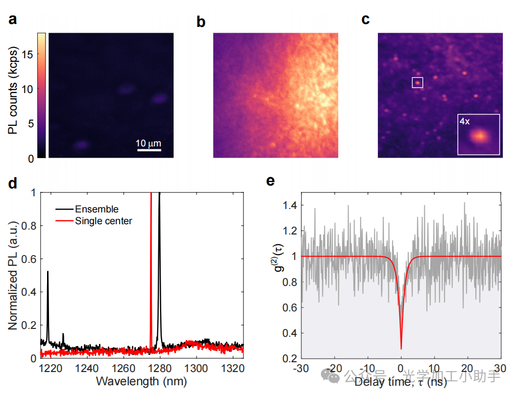 (e) 二阶自相关性测量,显示出在零延迟时明显的反束缚效应,证明了单一中心的孤立。