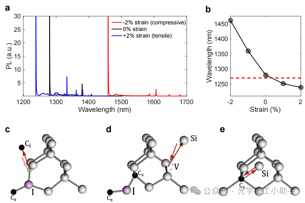 (b) G中心的ZPL与应变的关系,相对于未应变值。红色虚线表示在退火30秒的硅样品中的缺陷的ZPL(1270纳米)。相应的应变值为0.335%。