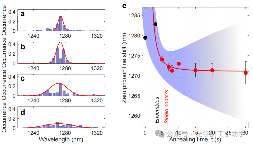 (e) 零声子线位移与退火时间的关系。虚线将单一中心与集合的退火范围分开。实线红色曲线对应现象学的多项式拟合。图4(e)中的误差条对应于高斯拟合中ZPL分布的不确定性。