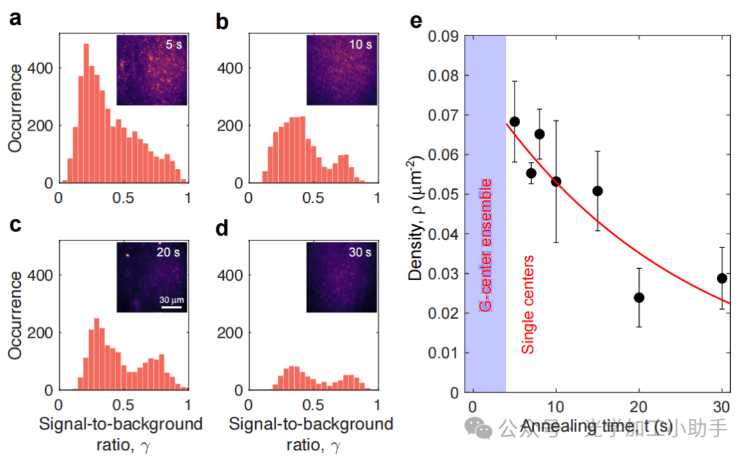 在图3和图4中,我们根据以下特征将缺陷视为单一中心:空间孤立、O带中明显的尖锐零声子线(<0.3纳米)和二阶自相关函数中的反束缚效应。图3(a)-(d)展示了发射体在信号与背景比率(SBR)γ的函数下的分布。SBR值大于0.5表示发射来自单一发射体。其他缺陷也对应于单一中心,但它们的发射速率与背景光致发光相当,并且反束缚效应的值不会低于0.5(见补充材料1)。值得注意的是,低SBR不太可能来源于多个发射体,因为其光谱仅显示一个尖锐的零声子线。随着退火时间从5秒、10秒、20秒到30秒的增加,SBR(γ)大于0.5的单一发射体的比例从24%增加到40%。对应于单光子源的发光点的相对百分比随着退火时间的增加而增加。值得注意的是,孤立发射体的光致发光计数与退火时间无关。这表明,信号与背景比率正在改善,这是由于退火时间增加时背景信号的降低(见补充材料1)。