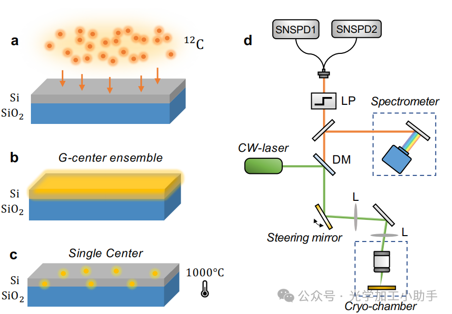 (a-c) 制造过程使用标准的商业SOI晶圆,在36 keV下进行碳离子植入,氟率为5 × 10¹³ cm⁻²(a)。植入结果在硅层的中部形成了一个G中心集合(b)。单一颜色中心的创建需要在受控条件下进行快速热退火处理(c)。