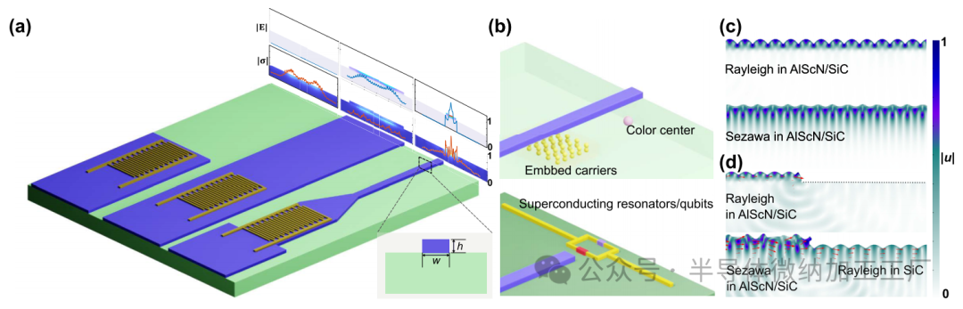 (a) 三种不同类型声学器件的示意图。设备边缘的右上角插图分别为对应声学器件中电场的归一化分布(上图)和每个声子的应力(下图)。右下角插图为AlScN声学波导在SiC基板上的横截面示意图。