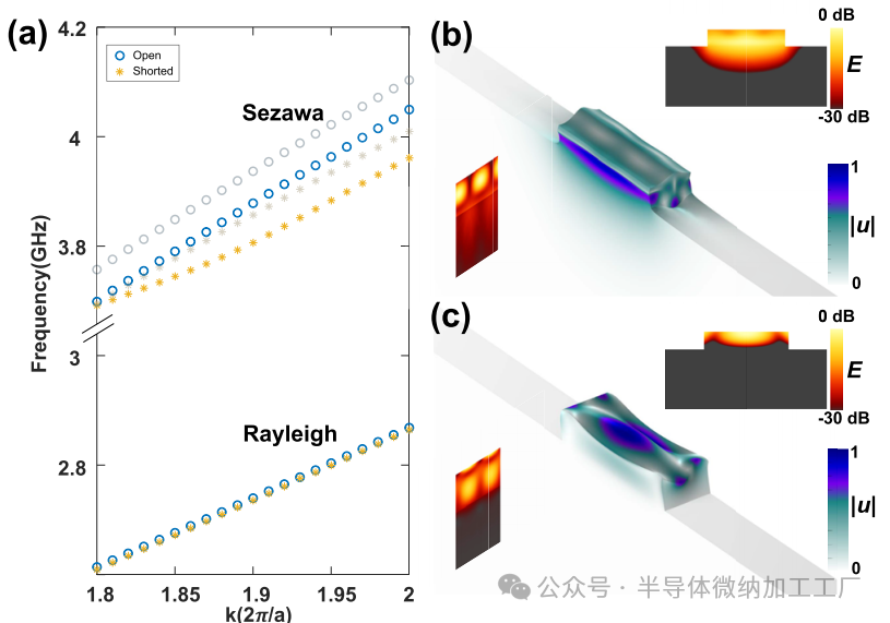 (a) 在开路和短路边界条件下(分别用圆圈和星号表示)声学波导模式的色散图(w = 3λ)。灰色区域代表大约4 GHz处的另一个类似Sezawa模式(详见附录B)。