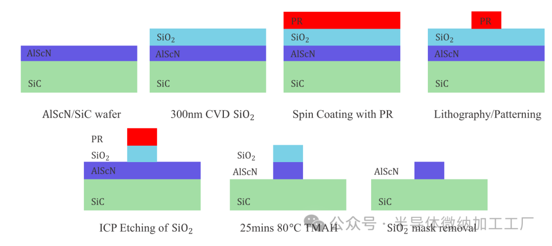 接下来,我们使用湿化学刻蚀工艺制造了板状和直线波导声学延迟线,具体步骤如图4所示,制造的AlScN/SiC芯片见图5(a)和5(b)。首先,通过等离子体增强化学气相沉积(PECVD)工艺在AlScN/SiC芯片上生长300 μm的二氧化硅(SiO₂)层。接着,通过光学光刻技术在SiO₂上图案化光刻胶(PR)掩模。然后,使用CF₄/O₂/Ar等离子体通过感应耦合等离子体(ICP)干法刻蚀将SiO₂图案化作为硬掩膜。去除光刻胶后,芯片在25%的四甲基铵氢氧化物(TMAH)溶液中进行1 μm AlScN薄膜的通过刻蚀,刻蚀温度为80°C,时间为25分钟。最后,通过将SiO₂硬掩膜浸入5%氟化氢(HF)溶液中3分钟进行去除。在直线波导延迟线中,声子通过320 μm长的角度锥形耦合进入波导。两种类型延迟线中的声子传播长度L从500 μm到2000 μm不等,不包括两个锥形区域的长度。