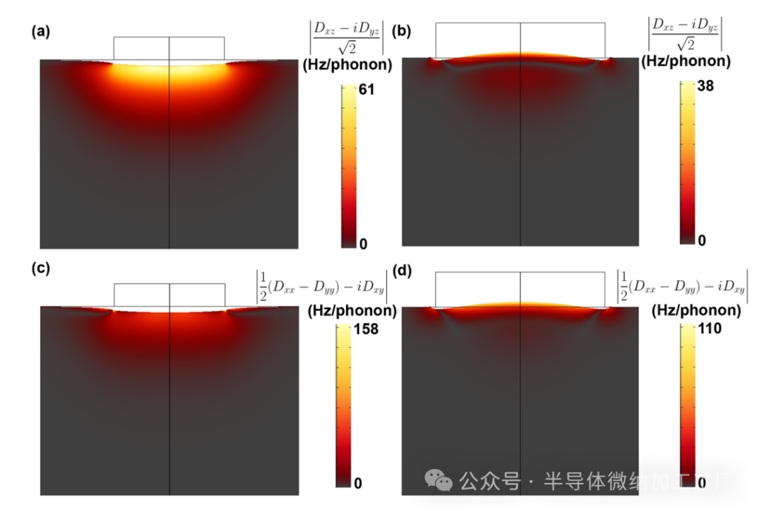 我们研究了与hh双空位中心的应变耦合强度,该中心具有C3v对称性。因此,我们探讨了模型不同方向的耦合强度,并仅比较了最强耦合的情况(详细信息见附录K)。图7中绘制了这些项的横截面空间分布。如图7(a)和7(b)所示,与瑞利模式相比,Sezawa模式在SiC中hh双空位中心的Δms = ±1自旋跃迁上的每个声子的最大耦合强度明显更强。在这种情况下,两个模式都表现出最大耦合位置位于AlScN波导的中部。对于Sezawa模式,其耦合强度场显著深入,表明其能够与嵌入SiC基板较深处的色心相互作用。在图7(c)和7(d)所示的另一个案例中,这些模式与Δms = ±2自旋跃迁耦合,Sezawa模式的最大耦合位置位于AlScN波导的侧面,并且每个声子的耦合强度仍然明显强于瑞利模式。这些结果展示了我们压电平台在为嵌入SiC基板中的色心提供声子耦合方面的巨大潜力。