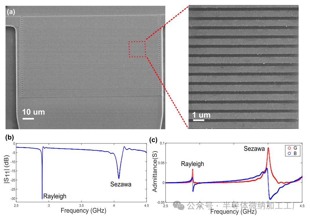(a) 扫描电子显微镜(SEM)图像,显示用于将表面声波引入波导锥形的指形换能器(IDT)。
