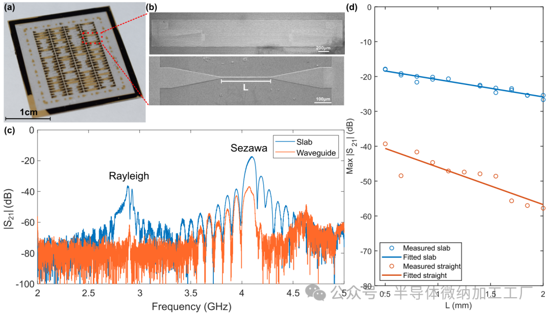(d) 对不同长度设备中Sezawa模式的最大∣S21∣传输进行线性拟合,以确定传播损耗和插入损耗。