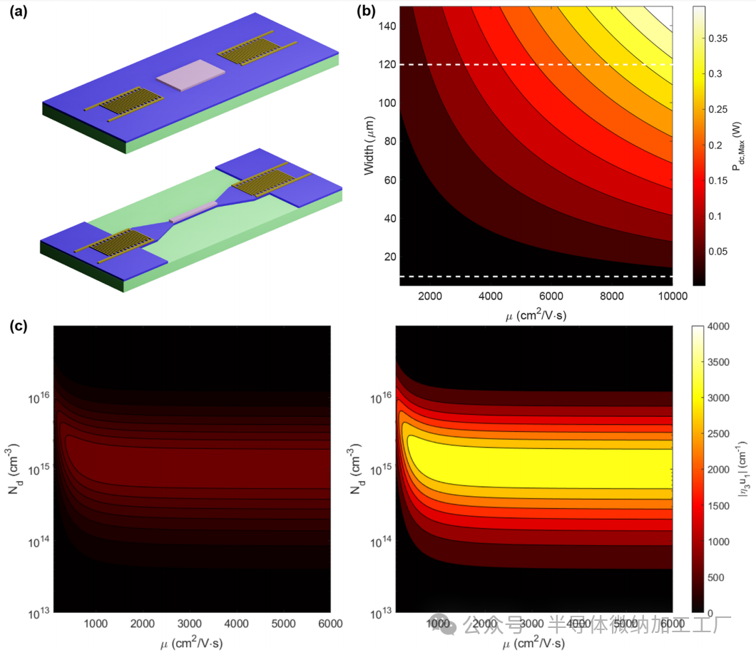 (b) 在半导体宽度从5 μm到150 μm、迁移率从10到10,000(cm²/V·s)变化时的最大增益下的直流功率损耗。白色虚线表示在(a)中示意的板状和波导设计中估算的半导体宽度的AE放大器。