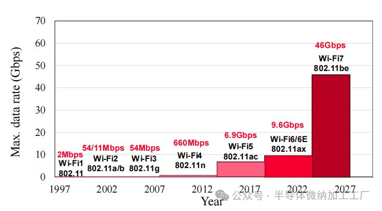 其中C是通信媒介上能承载的最大容量(比特每秒),B是可用带宽(赫兹),S/N表示信号与噪声比(SNR)。这表明,如果需要提高最大容量C,就需要增加可用带宽B和/或增加信号强度和/或减少噪声水平。由于C与B成正比,Wi-Fi的带宽已从20 MHz(11a/g)扩展到40 MHz(11n),再到160 MHz(11ac, 11ax),以及320 MHz(11be),因此理论上的最大数据速率不断提高,如图1所示,Wi-Fi 7的最大数据速率达到了46 Gbps。为了支持Wi-Fi通信系统,需要能够处理5 GHz或更高频率的高频和宽带滤波器。由电感和电容组成的LC滤波器能够满足这些需求,但声波(AW)滤波器也因其良好的陡峭度和小尺寸要求而具有吸引力。传统的表面声波(SAW)滤波器由于插指换能器(IDT)的微型化限制,被认为难以实现超过3 GHz的频率。因此,已经提出了一些基于比传统雷利模式和剪切水平(SH)模式具有更高相速度的声波模式,或通过使用谐波的SAW设备[2-10],这些设备工作在超过3 GHz的频率下。