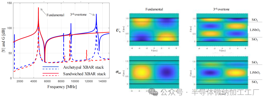 图4. 在典型XBAR的无限二维周期模型中,基频和三次泛音模式响应的共振频率下,计算的导纳(|Y|)、导纳(G)、X方向位移(Ux)和应力(σxz)分布。