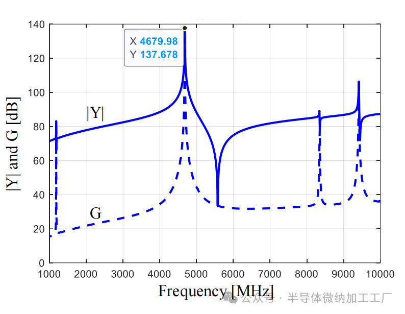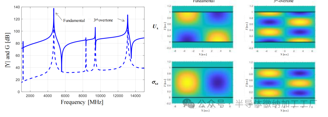 接下来,我们讨论厚度方向上不希望的高阶模式。图4展示了在宽频范围内计算的XBAR谐振器的典型特性。由于XBAR模式是沿厚度方向传播的声波,因此本征上会激发泛音模式。
